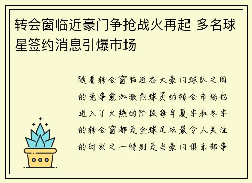 随着转会窗临近,各大豪门球队的竞争愈发激烈,尤其是当多个顶级球员成为市场上的焦点时,转会市场的热度迅速上升。通过对豪门球队需求变化、市场上热门球员、转会策略的变化以及经济因素的分析,可以看到,转会市场的动态不仅仅受竞技因素的驱动,更受到经济利益的深刻影响。无论是俱乐部的引援需求,还是球员的转会选择,都充满了复杂的博弈。